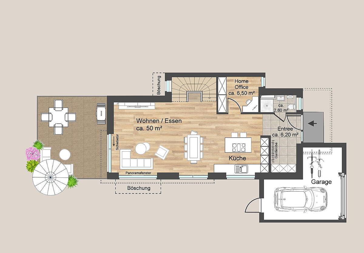 Das Raumkonzept des Erdgeschosses ist offen gestaltet, die Bereiche Wohnen, Essen und Küche verbinden sich wunderbar und stimmig zu einer Einheit. Im Trend der Zeit verfügt das Konzept auf dieser Ebene zusätzlich über ein in sich abgeschlossenen Home-Office-Bereich.
