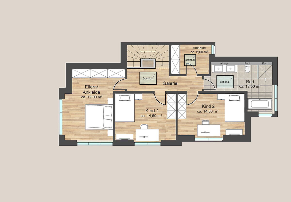 Mehrere, teilweise elektrische, Oberlichter (Flachdachfenster) im Obergeschoss sorgen für ganz besondere Lichtverhältnisse. Von der großzügigen Galerie aus gelangen Sie in die Kinderzimmer und über das vorgelagerte Ankleidezimmer in das lichtdurchflutete Schlafzimmer. Die Deckenhöhen öffnen sich hier auf ca. 2,75 m.